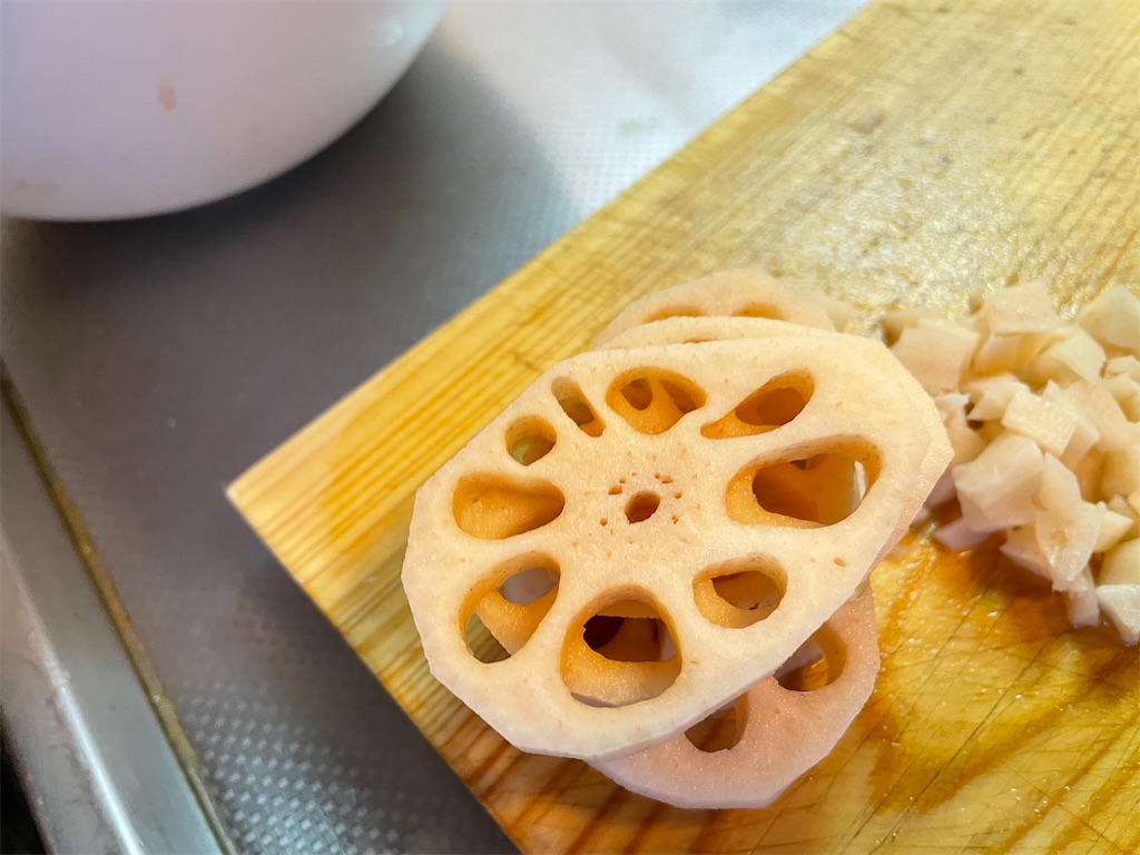 レンコンの形に合わせて角を取り、形を整えます。かなりの作業量です。