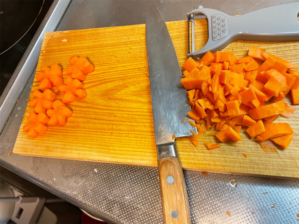同じように人参も飾り包丁をいれます。めちゃくちゃ大変です。