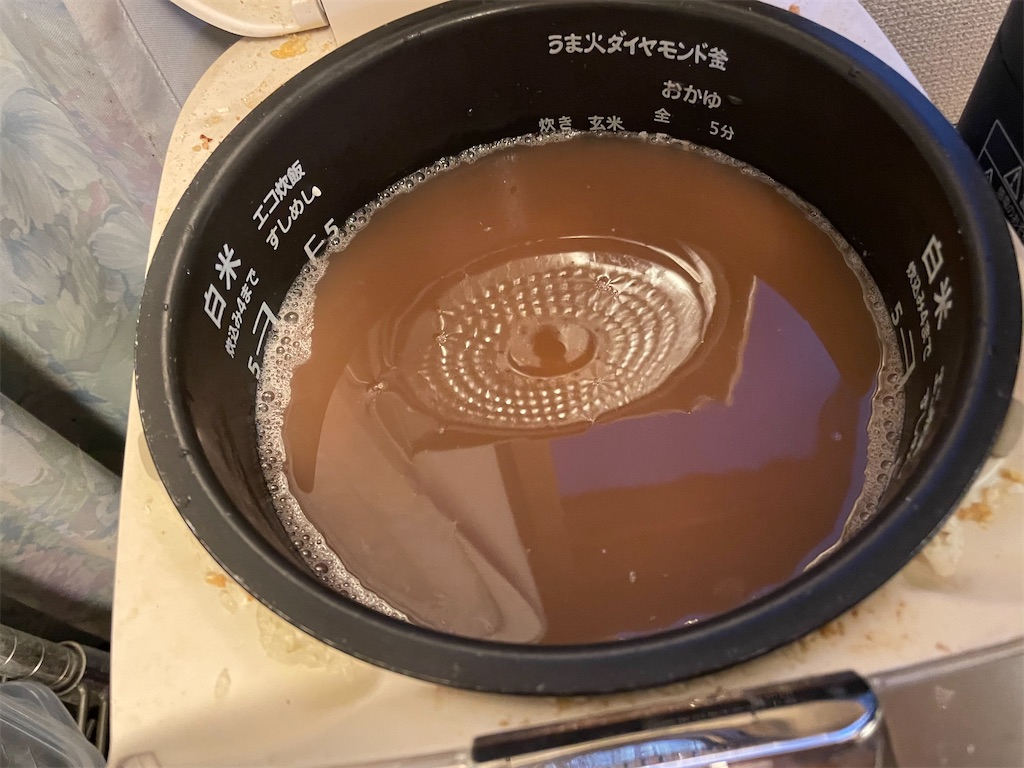 あずきを茹でて、捨てて、もう一回茹でて、もち米とともに炊きます。